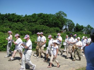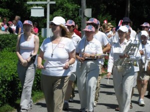 It was a beautiful day, sunny, but not hot, and we started off energetically, playing as we marched: “Yankee Doodle,” “The Battle Hymn of the Republic,” and other tunes. This was the first time I have ever marched and played at the same time. The Moors band marches along, but stops to play songs along the way, then begins marching again. I have to admit it took some getting used to, to hold the flute just right so that the music was in view, and not bouncing around too much. In high school, I was one of a few who was not accepted for the marching band (I actually fainted during one incredibly hot August band rehearsal), so it was an accomplishment just to walk and play at the same time–no fancing march steps were involved today!