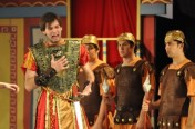 Connor Lewis is Erronius, who is away throughout most of the play, off seeking his children who were stolen at birth by pirates. He brings laughs as he staggers across the stage several times in his quest to circle the seven hills of Rome seven times, but ultimately provides all the answers.