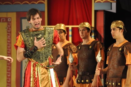 In addition to playing the narrator, Mr. Soller is also the lead, the slave Pseudolus, who seeks to obtain his freedom by presenting Hero (Alexander Daly) with Philia (Christine Lacey), a courtesan from Crete. Having caught sight of Philia through a window, Hero knows nothing of love, revealed in his very amusing “Love, I Hear,” of his very recent discovery.