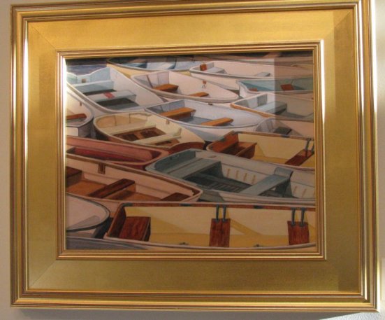 Contemporary artist Megan Hinton is featured in the exhibit, and I talked to her at the opening reception for the show on April 3. A resident of Wellfleet, she was happy to be included in the show, along with many well-respected maritime artists, including Ross Moffett, a painter she has been inspired by. Megan calls herself an abstract representational painter, greatly influenced by painters of the mid-20th century, the 1940s to 1960s in the United States and Europe. She mentioned Nicolas De Stael (1914-1955), in particular, a Russian known for his abstract landscapes.
