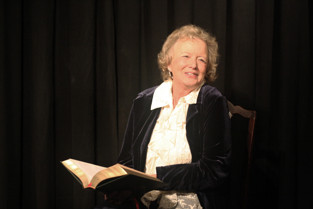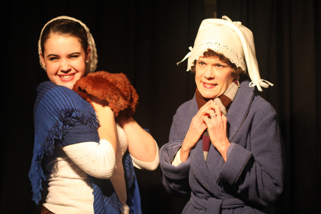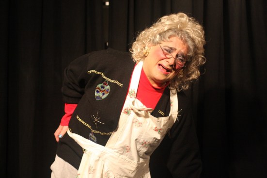 Still waiting for the missing actors, Phoebe starts auditioning audience members to play the role of Scrooge. Just as she is about to settle on someone, the delayed actors finally arrive. Mrs. Stephen Doyle plays Thelma Greenwood, the brusque, humorless woman who is perfectly cast to play Scrooge. Ms. Doyle is excellent in this role, enriching it with subtle touches, as when she (as Scrooge) refers to the traces of dirt beneath his fingernails and gives a sly little glance to her own bright red polished nails.