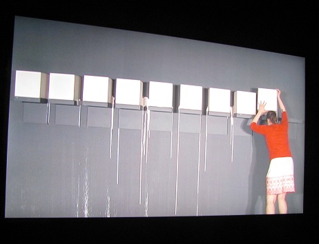 Kate Gilmore’s 8-minute film, “Blood from a Stone,” shows a daintily dressed woman hauling heavy (75 pound) white cubes to a series of shelves above her head. Once placed, the boxes begin to drip white paint, creating their own artistic expression. The film represents women’s struggles, and evokes similar films of difficult tasks by women artists of the 1970s.