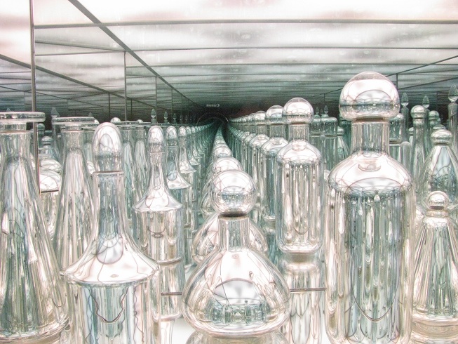 Lovely to look at and intriguing to behold is Josiah McElheny’s “Endlessly Repeating Twentieth Century Modernism,” a large cube with views of glass bottles, their images stretching to infinity. McElheny blows the glass bottles and the mirrors to create the illusions. The mirrors reflect only the bottles, not the curious visitors.