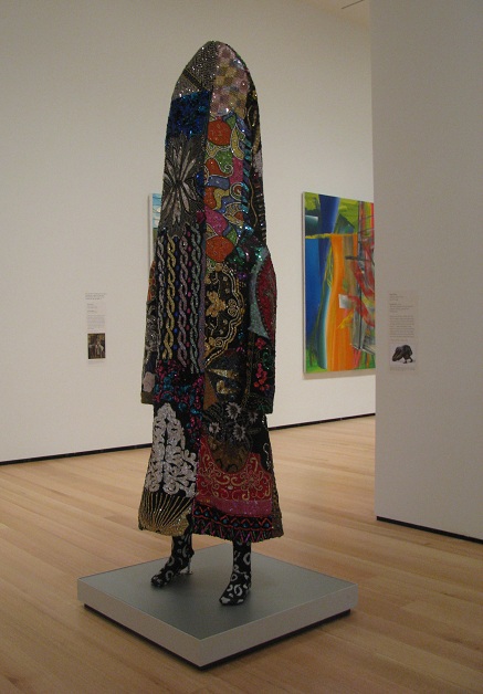 “Sound Suit,” by Nick Cave, made of fabric with applique, found sequined materials, beading, crocheted and knitted yarns. Cave is a dancer and creates sound suits that he actually dances in, accompanied by the sound of the costume. “The elongated headdress and obscured face transform the wearer into a dazzling otherworldly creature.”