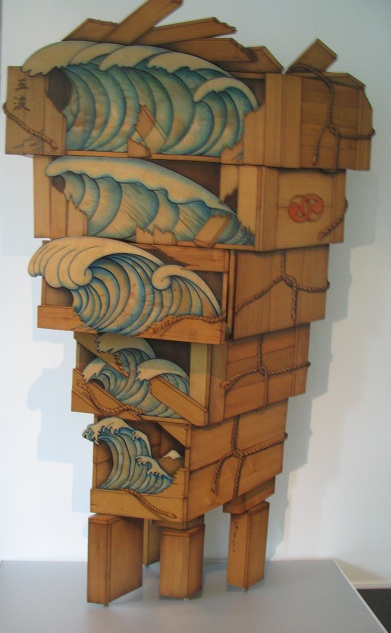 “How to Wrap Five Waves,” by John Cederquist, is a light-hearted depiction of waves, in the Japanese painting style, tenuously contained in a top-heavy bureau of sorts. The waves in soft shades of blue, green, and gold are tied in boxes stacked on one another.