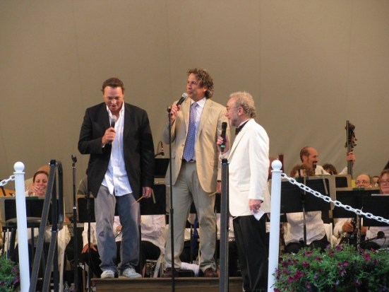 I was also worried about the instruments, particularly the string instruments. The orchestra is under a canopy, but open to the elements, and wooden instruments do not take kindly to raindrops. When I asked him what precautions were being made to protect the instruments, the orchestra’s public relations person told me that Dennis Alves, artistic director, was “keeping all the string instruments (20 violins, 8 violas, 8 cellos, 6 string basses) on the truck.” Only one string bass would be played, by principal bass player, Robert Caplin, and some planned numbers would not be played.