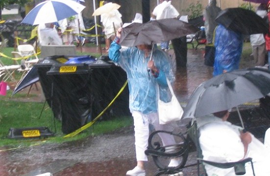 We had jackets, hats, and umbrellas, and, when we checked in, were given bright white plastic rain ponchos with cheery TD Bank logos in green. We headed for the press tent, where two people from Hyannis Patch, the online newspaper, had already set up a video camera for a time-lapsed photographic record of the Green filling up with people.
