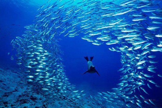 In one remarkable sequence, huge numbers of dolphins race through the water, leaping and diving, chasing a school of sardines, while, overhead, flocks of seabirds soar and divebomb into the water, after the fish themselves. Soon they are joined by whales and sharks.