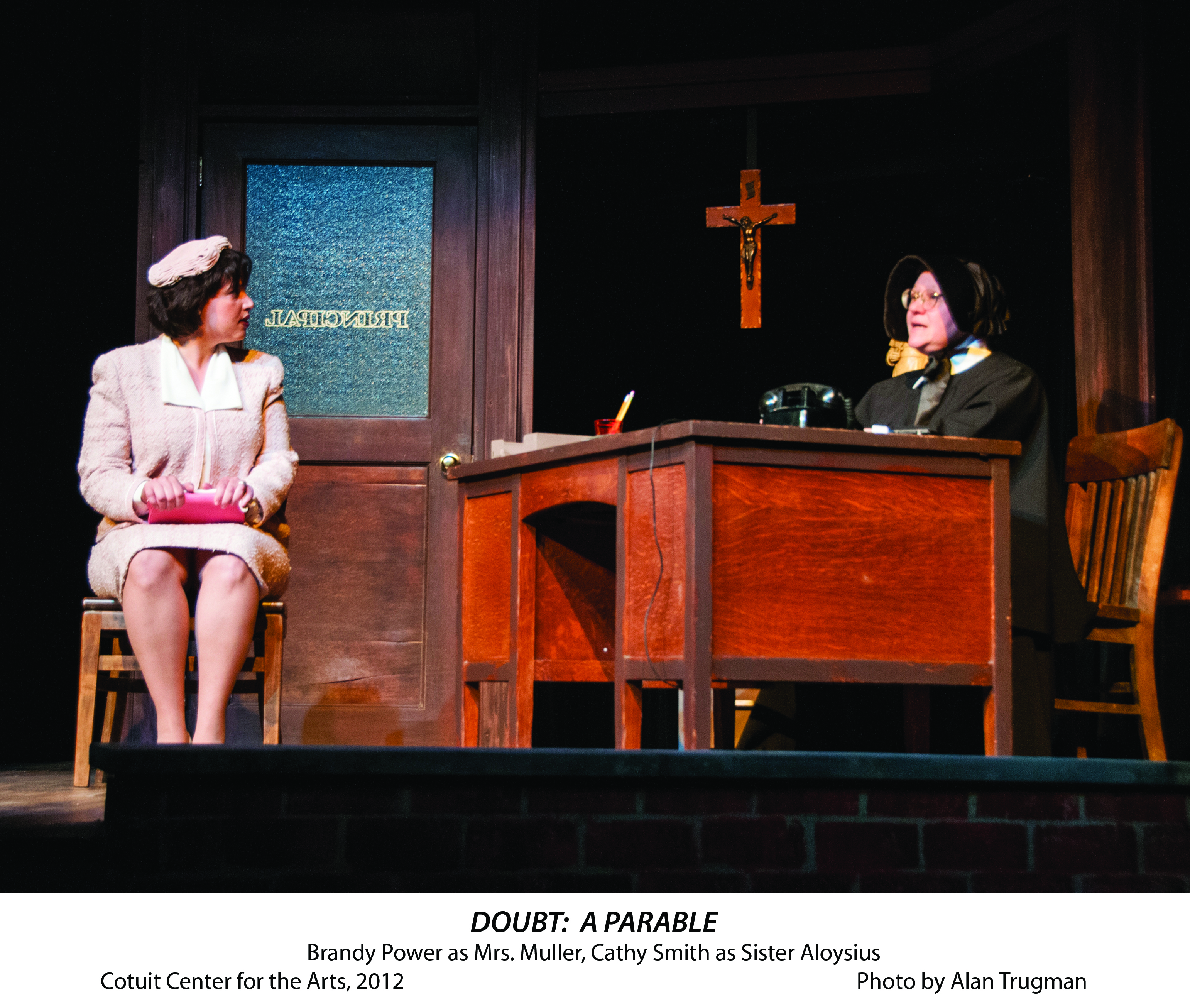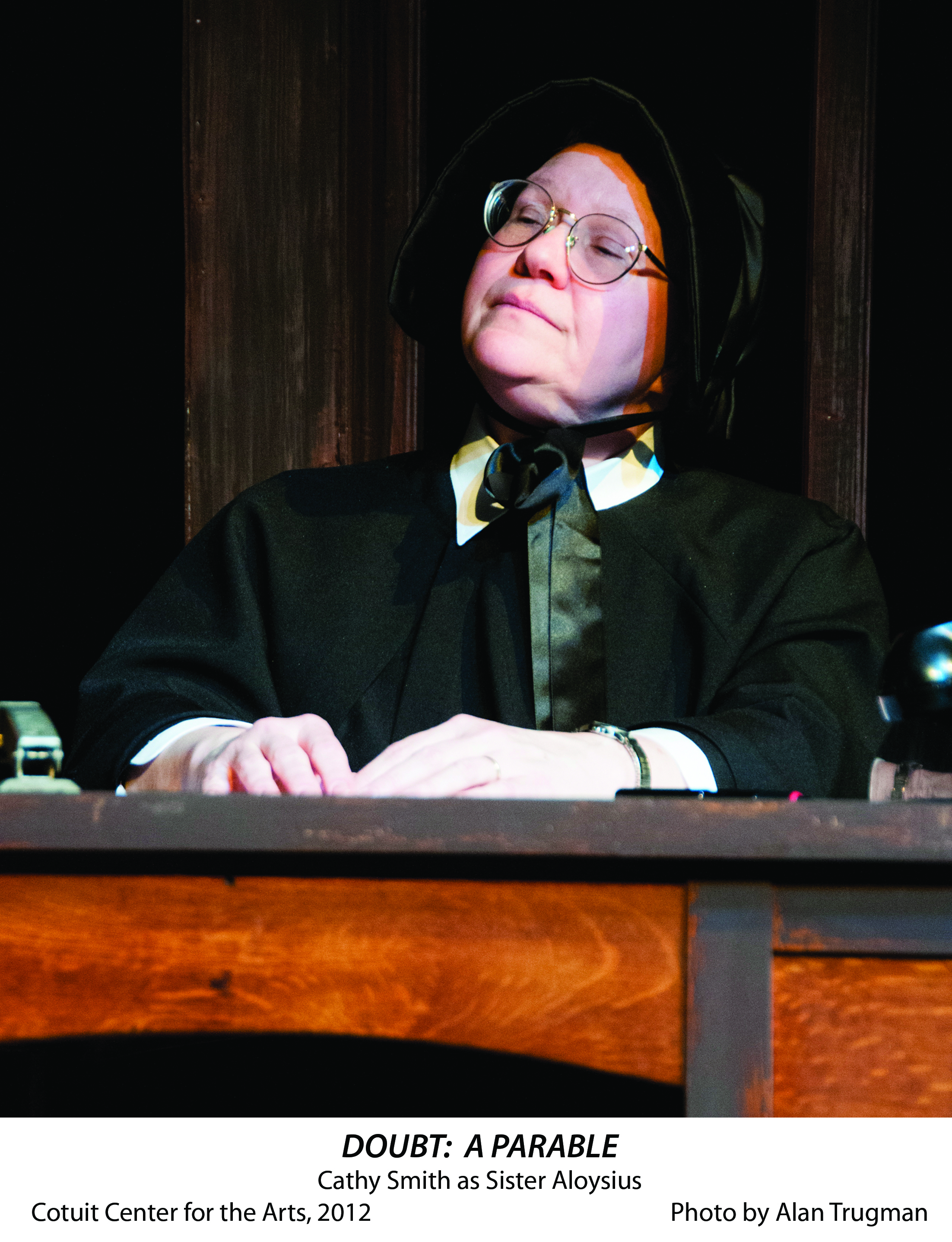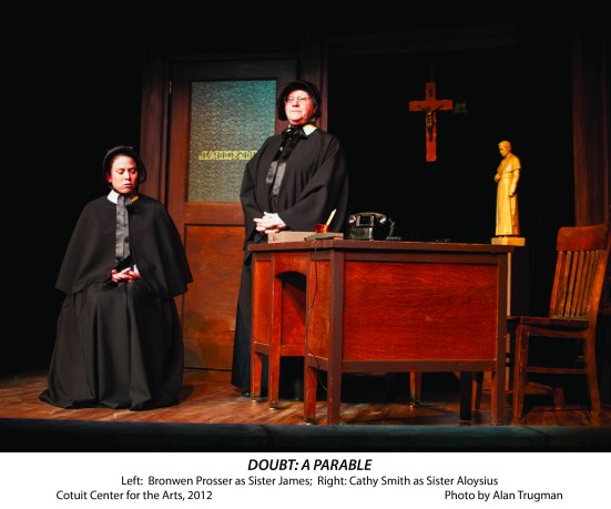 “Doubt: A Parable” won a Pulitzer Prize and a Tony Award in 2005 for its author, John Patrick Shanley, and it is easy to understand why, after seeing the Cotuit Center for the Arts’ current production of the play. The writing is superb, authentic, and often quite funny. The plot, deceivingly simple, invites each individual audience member to interpret it his or her own way. In fact, it was Shanley’s intent that the final act of the play be the continued discussion of it by audience members, each bringing their own biases and experiences to the task, and, ultimately, perhaps, understanding of the role that doubt and certainty play in our own lives.