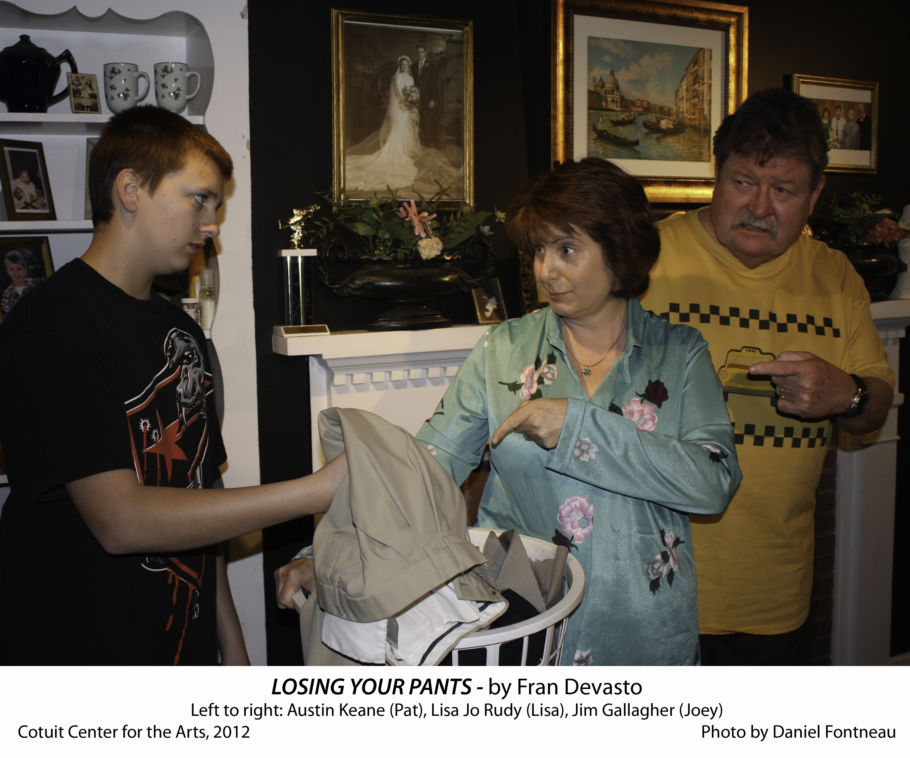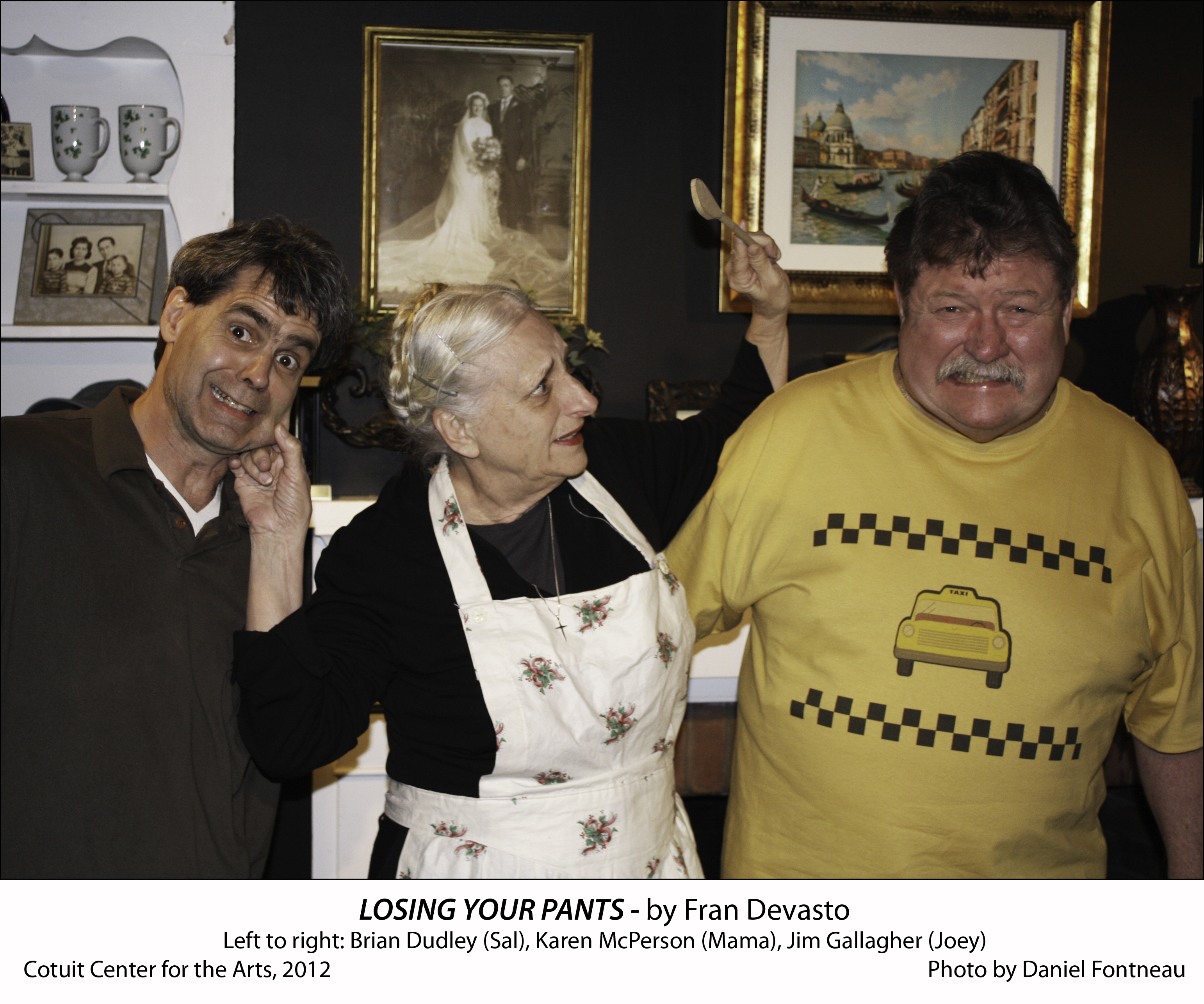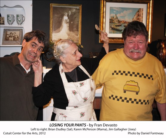 “Losing Your Pants was written by Fran DeVasto of Wellfleet and is based in part on his own extended Italian family. It is directed by PJ McKey, who makes it look like the play was written just for this space. (In fact, thought, the playwright’s goal is to use this Black Box run to test the play out for future runs in larger theaters, and that, too would work well, giving the characters more room to emote.)