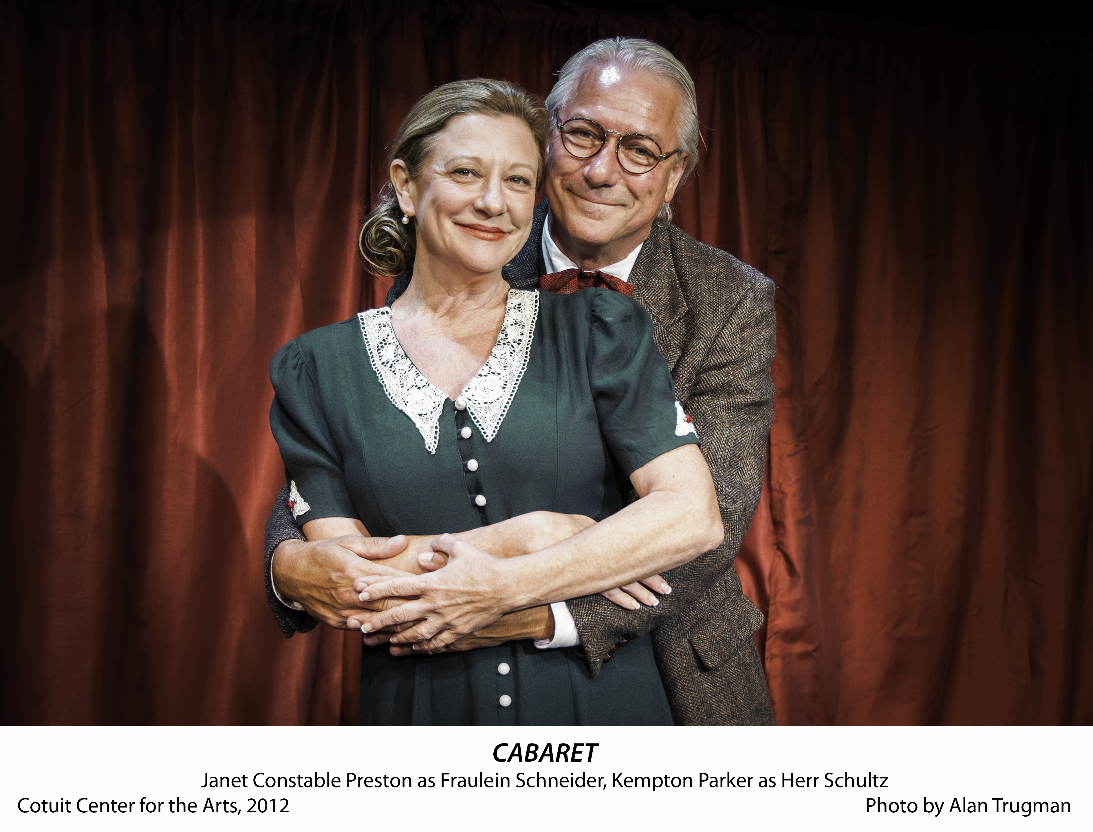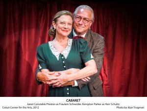 Janet Constable Preston is Fraulein Schneider, Cliff’s landlord. A strong presence, Preston conveys Fraulein Schneider’s sense of powerless well, from her inability to get Cliff to pay full price for his room (“So What”), to her fear of the consequences of her relationship with her Jewish suitor, the fruit grocer Herr Schultz (“What Would You Do?). In between there are some lovely romantic moments between Fraulein Schneider and the buoyantly optimistic Herr Schultz (“It Couldn’t Please Me More, or Pineapple Song”). Kempton Parker is perfect as Herr Schultz, caring and kind, and unwilling to believe that he could be in danger. After all, he is a German citizen.