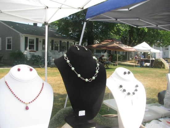 At the Falmouth Art Market, she offers earrings, necklace-and-earring sets, and anklets in a range of colorful stones with handmade components of silver and gold. Among the items on sale recently were a ruby necklace set, a sapphire necklace set with saltwater pearls, a necklace of Peruvian opals, and items with peach moonstone, topaz, and other gems.