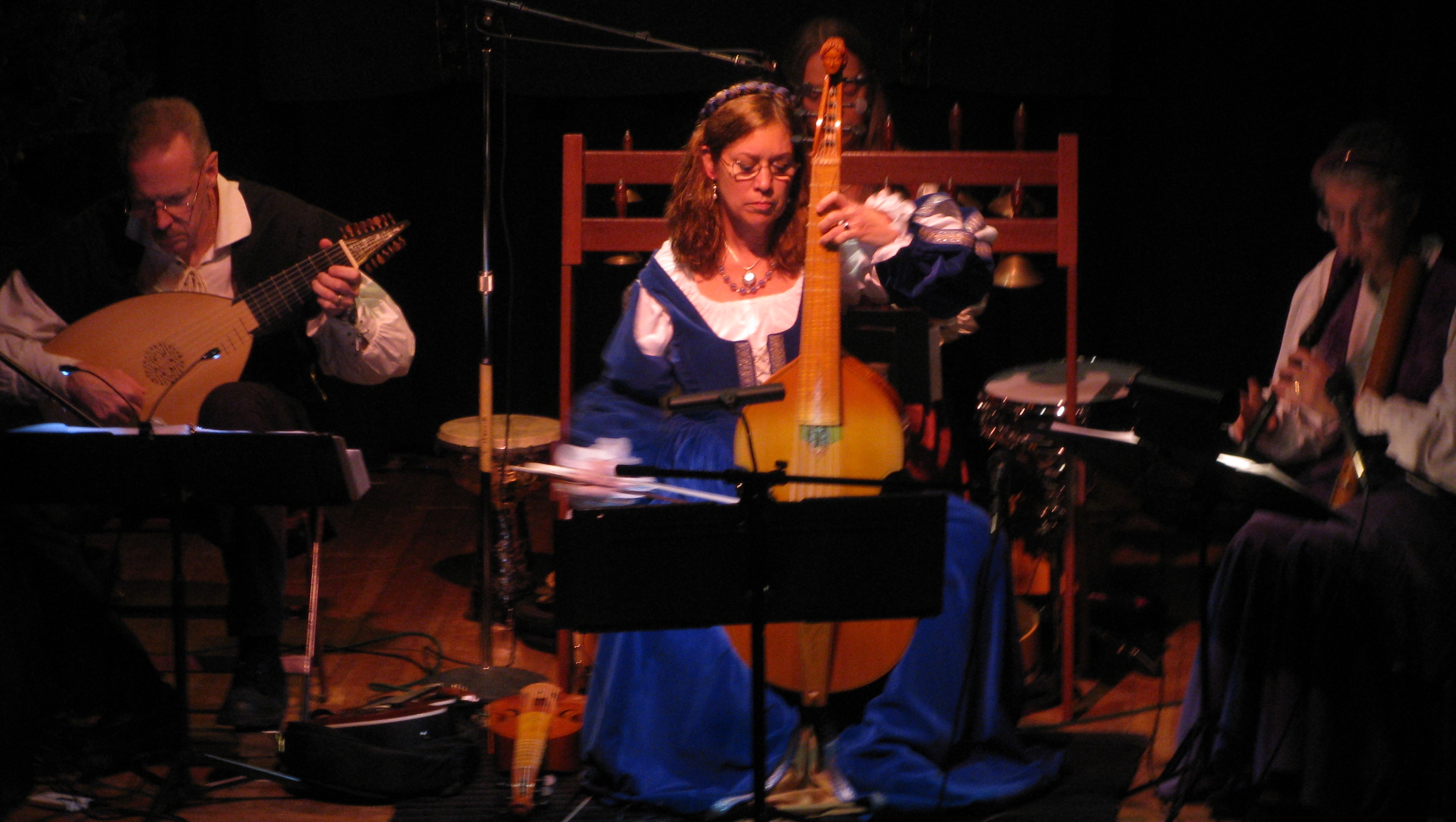 Passacaglia: Tom Hanna on lute, Molly Johnston on viola da gamba, Jan Elliott on recorder, and, behind Molly, Lisa Esperson on percussion.