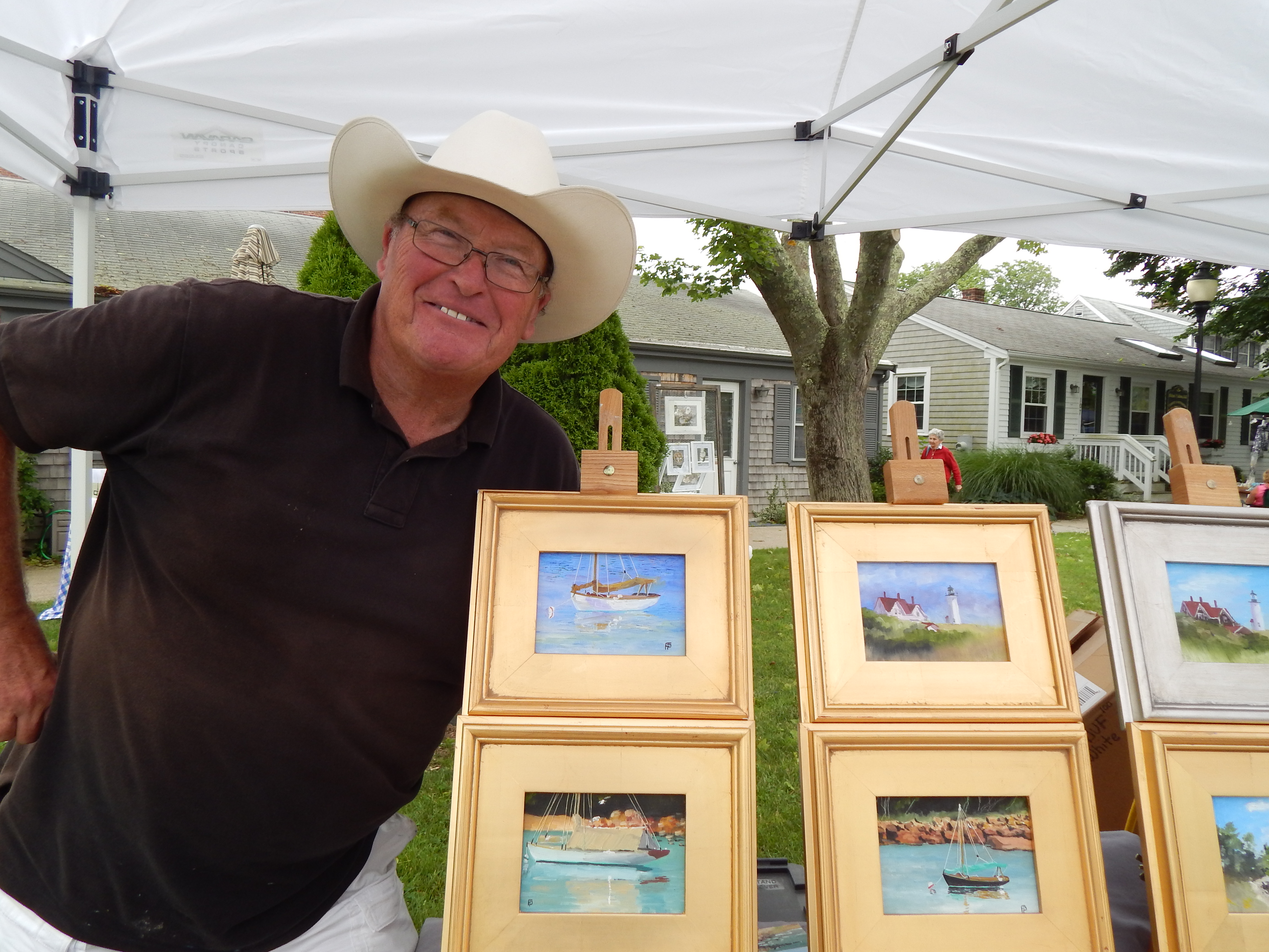 Oil painter Forrest Pirovano is one of the regulars at the Art Market. Pirovano grew up in New Jersey and Ohio and discovered New England and the Cape while serving with the U.S. Navy. After graduating from the Art Institute of Pittsburgh, he and his wife settled in Marshfield, where he eventually owned his own advertising agency.