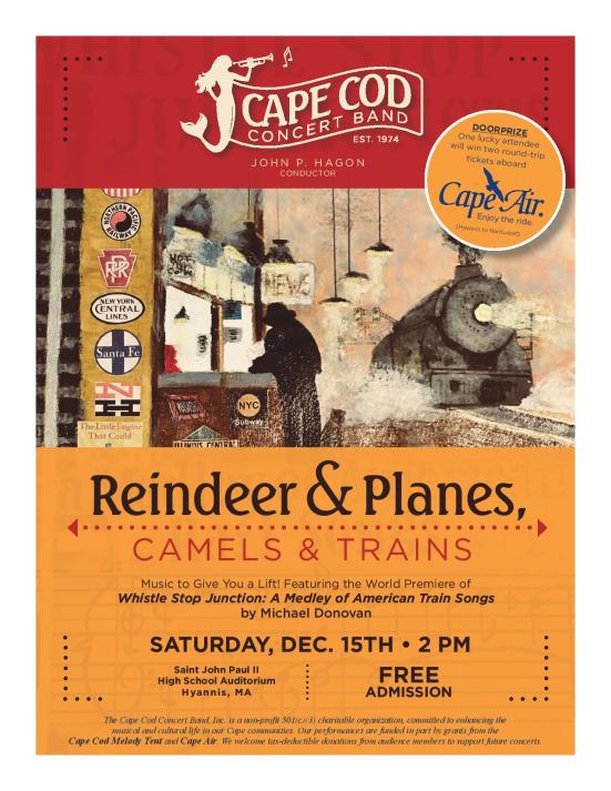 The Cape Cod Concert Band, John P. Hagon, conductor, presents Reindeer & Planes, Camels & Trains, a concert saluting holiday transport. The event features the world premiere of “Whistle Stop Junction: A Medley of American Rail Songs” by Cape composer, Michael Donovan. The journey begins on Saturday, December 15, at 2 PM. at the Saint John Paul II Auditorium, 120 High Street,Hyannis. Admission is free, but donations are welcome.