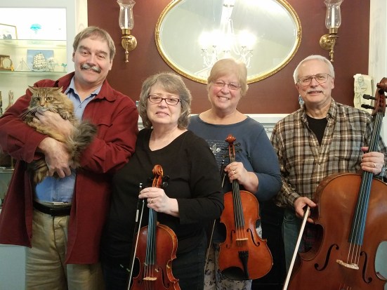 Fritz (with cat, Chula) and Laura Sonnichsen and Robin and Brian Kruse will perform a string quartet at the FCPO’s Fall Musicale.