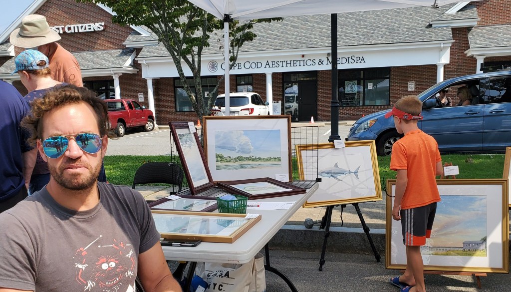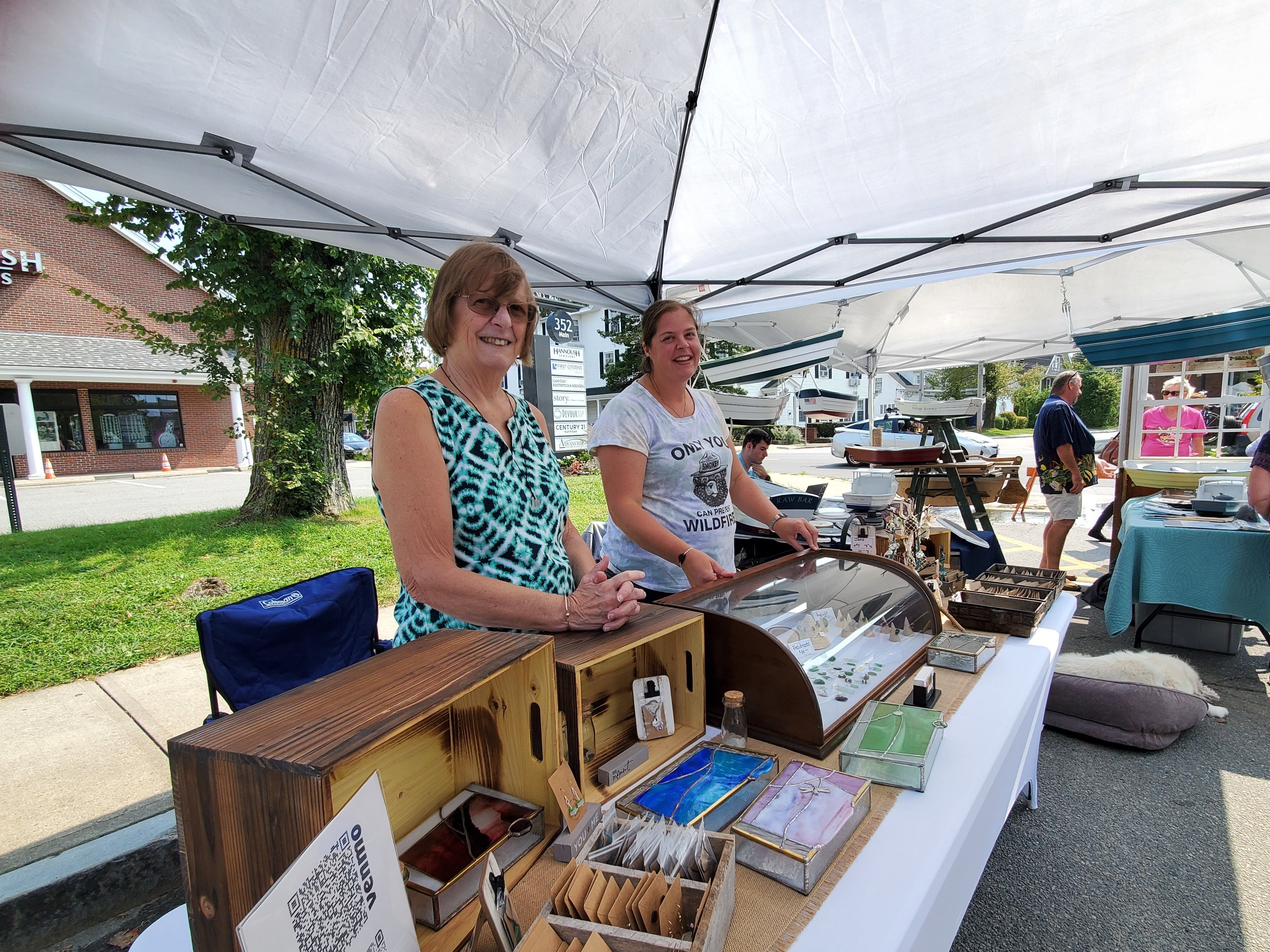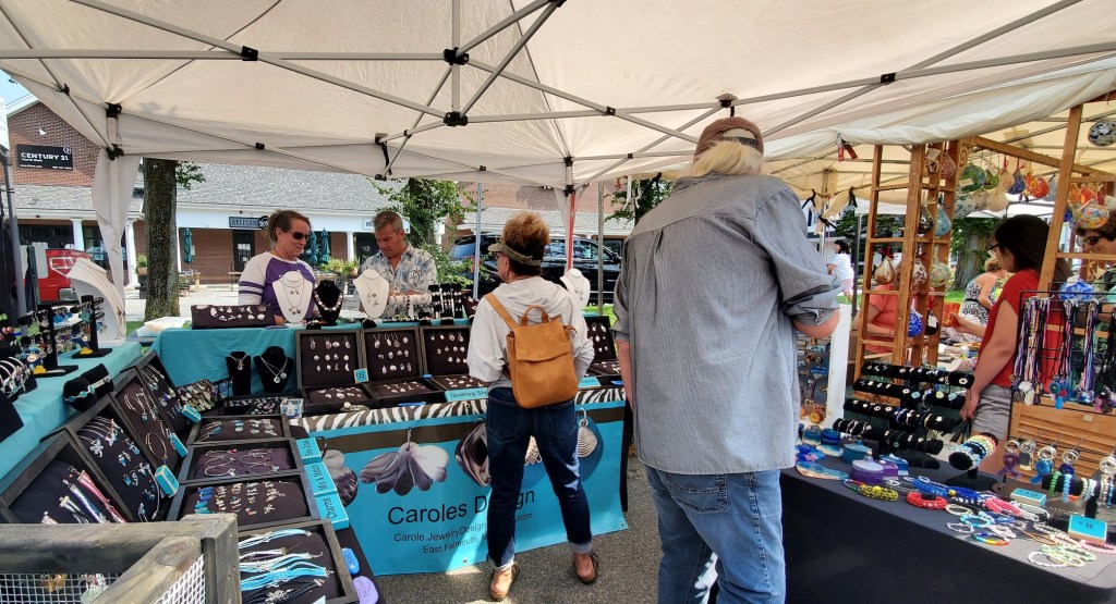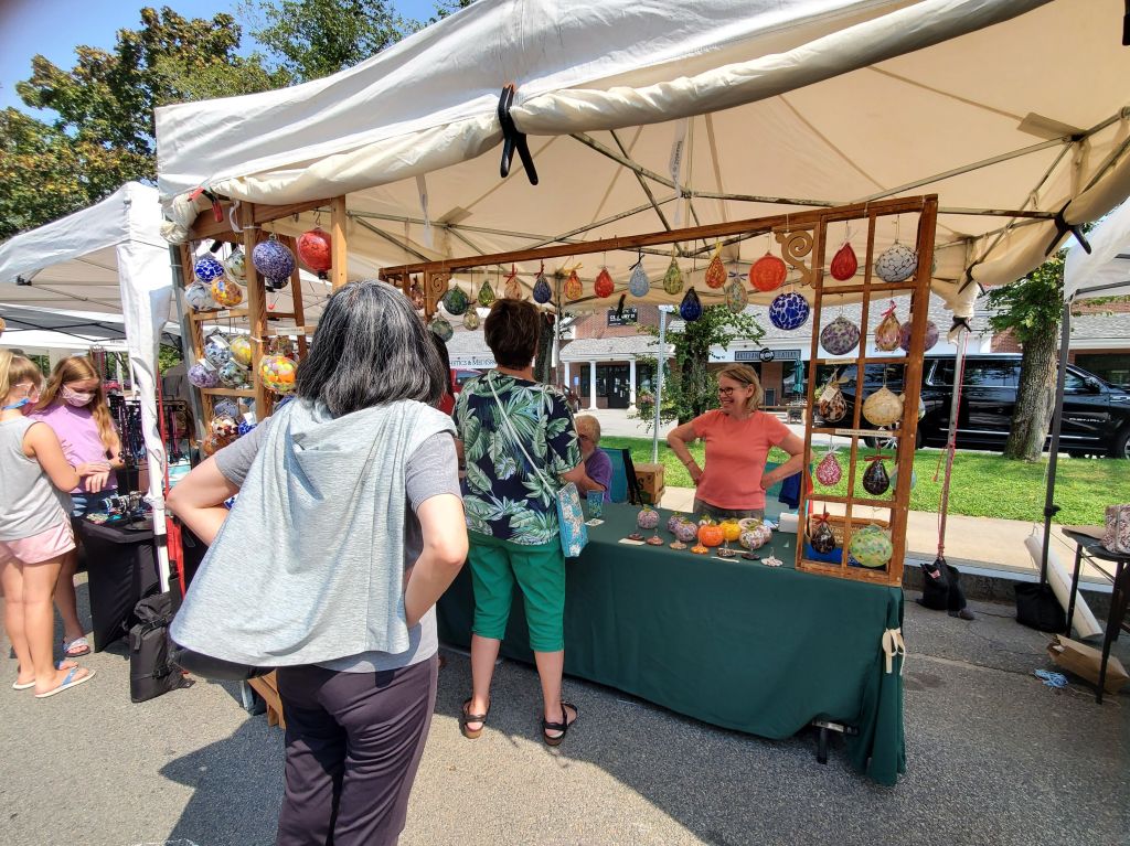 Artisan, nonprofit, and food vendor tents are open from 10 AM to 6 PM on Saturday and 11 AM to 5 PM on Sunday in three locations: Peg Noonan Park, the Falmouth Library Lawn, and Shore Street Extended.