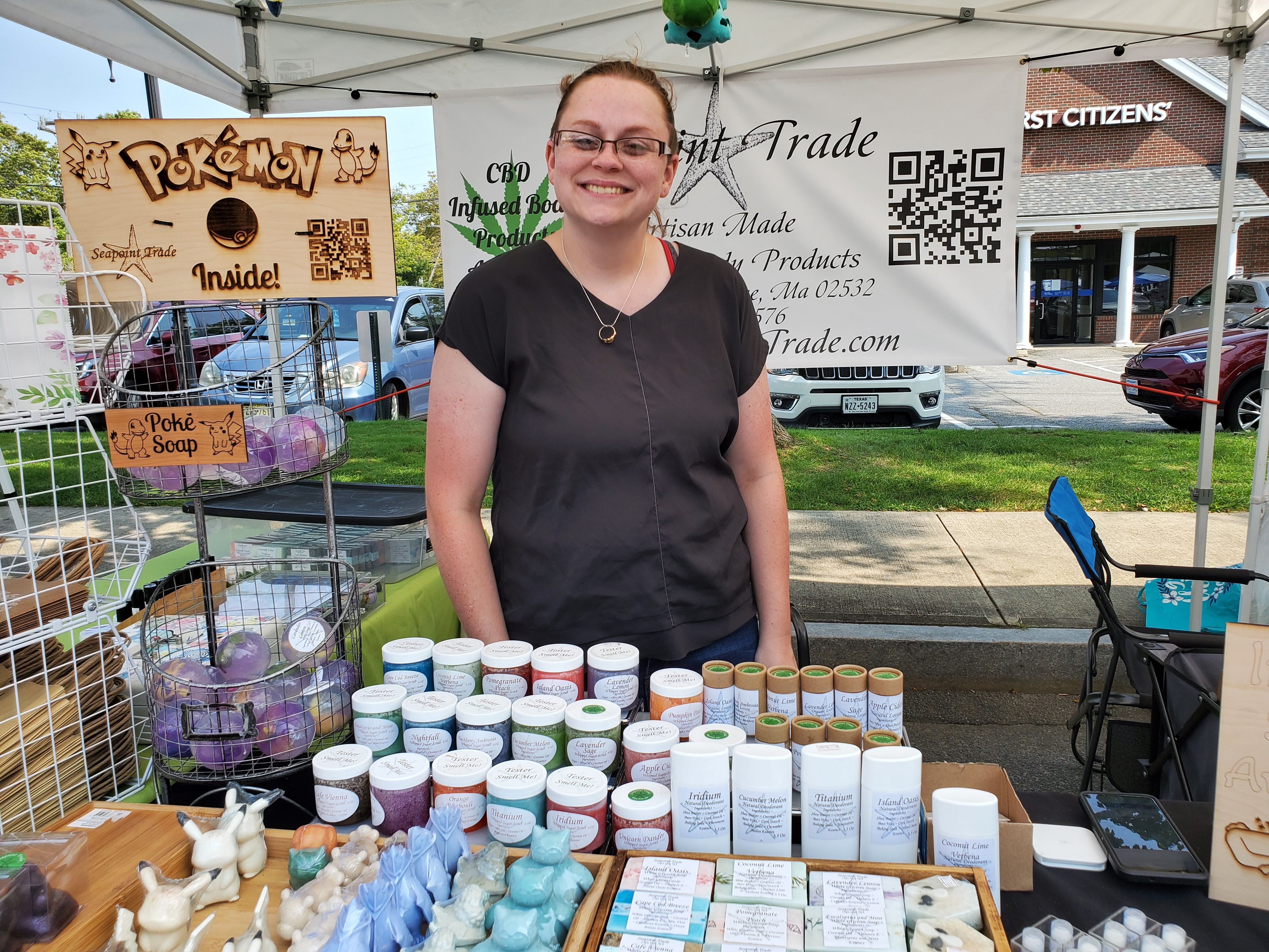 At Cape Cod Henna, JoAnn Whittemore offers henna body art, plus aroma therapy and bath products. Kaley Ledwidge, of Seapoint Trade, handcrafts bath essentials, including soaps, sugar scrubs, lotions, lip balms, deodorants, bath bombs, and CBD-infused products. Jillian Buck of Warm Delights Crafts, handcrafts candles from beeswax.