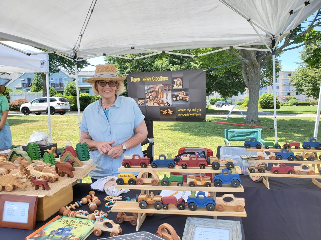 The Falmouth ArtMarket features over two dozen artists and craftspeople. Among them is Karen Teeley, of Karen Teeley Creations in Cotuit, who creates wooden toys. Long an avid crafter and woodworker, Teeley began making wooden toys when her son and daughter-in-law requested natural toys for their children, toys that did not have batteries, bells, whistles, or sirens; toys that would encourage creative play and keep kids away from screens.