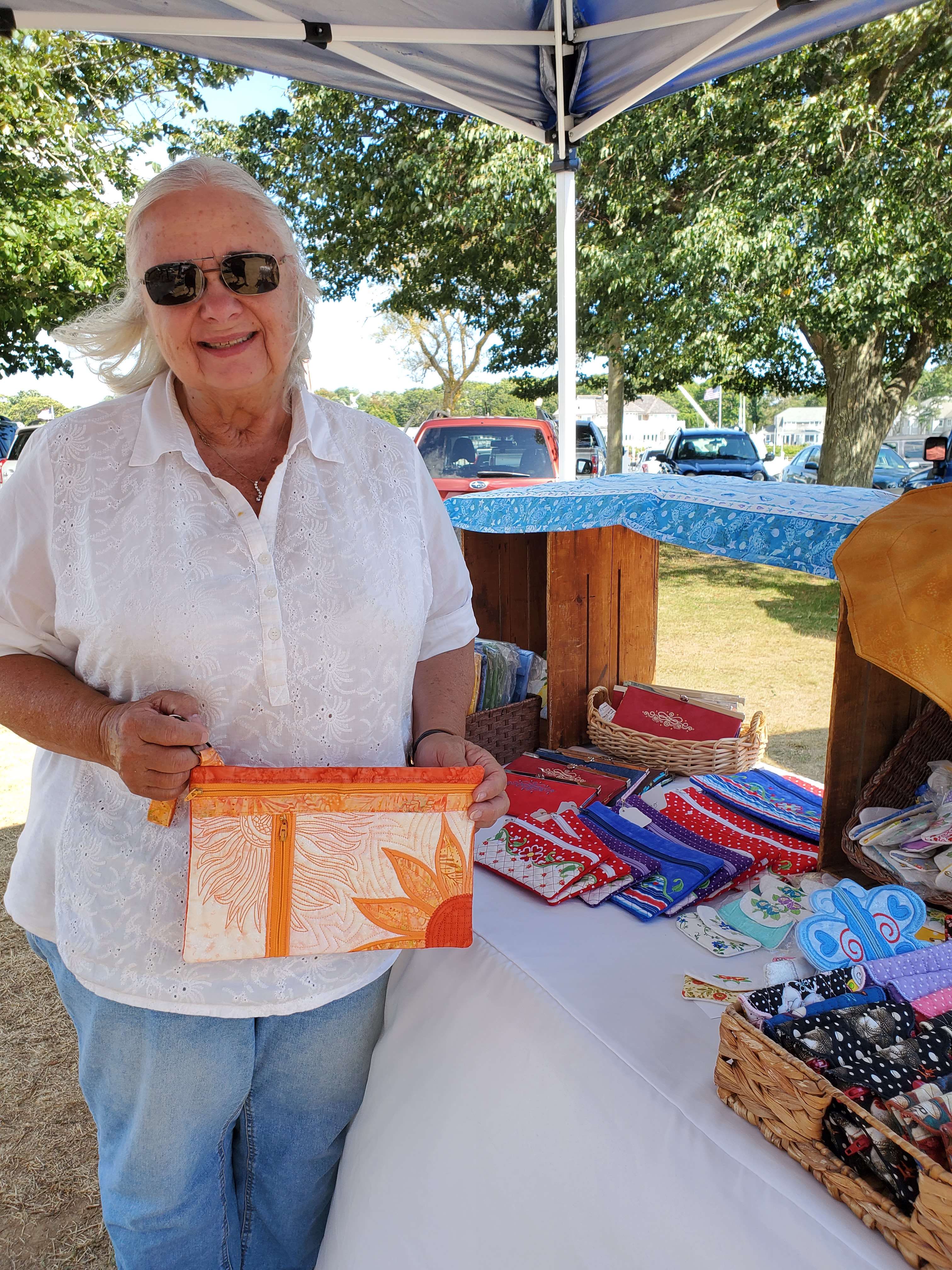 Shirley Hendrickson is one of the many artists and craftspeople showing their wares at the Falmouth ArtMarket. She “has a passion for sewing.” She handcrafts a wide range of quilted, handsewn and machine-embroidered items, including assorted sizes and types of bags, zippered pouches, wallets, checkbook covers, table runners, doll clothes, wallets, matching quilted and embroidered potholders and dish towels, and dresses for little girls.