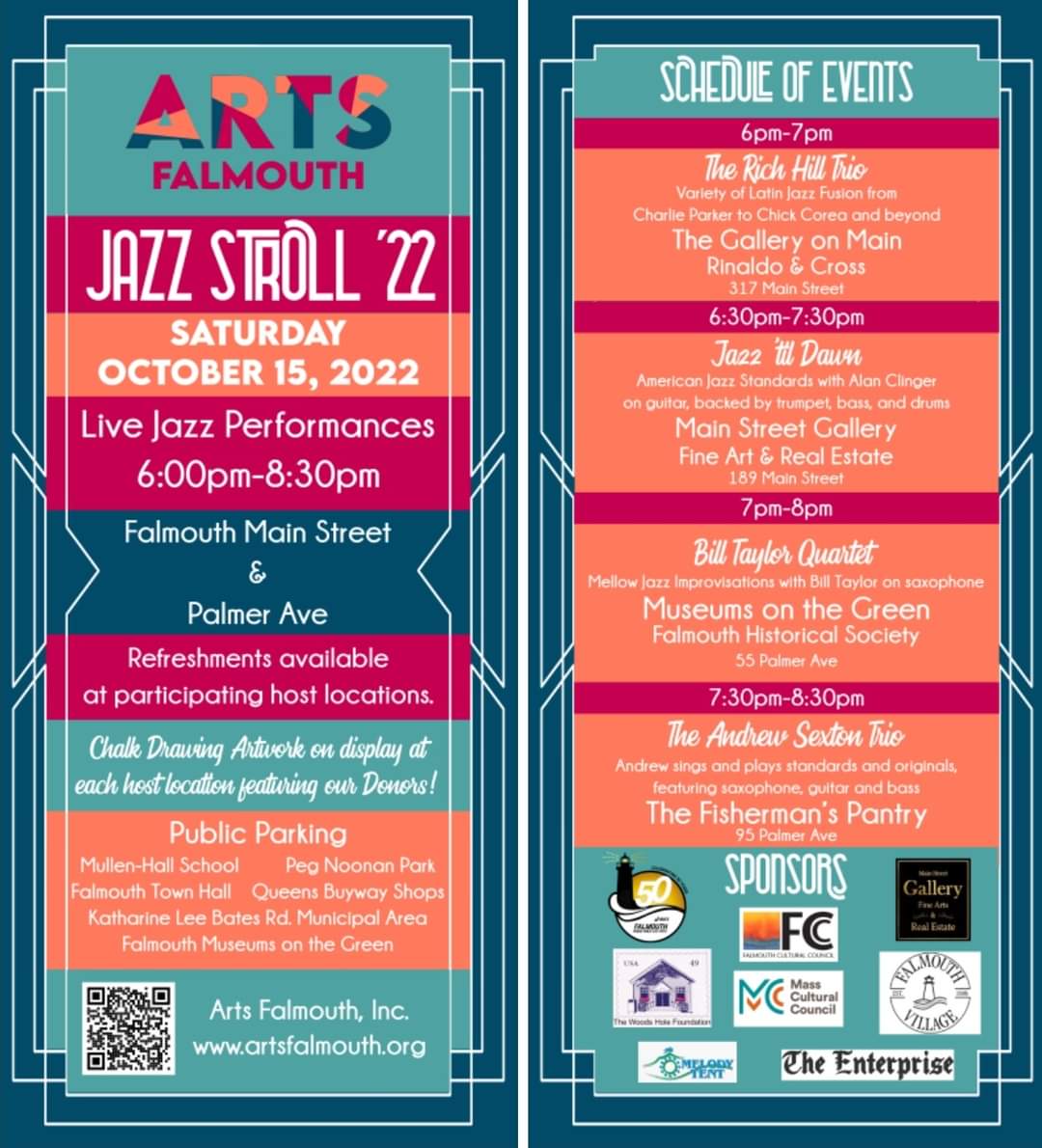 Pick up a copy of the rack card (pictured below) at Jazz Stroll venues and other locations in Falmouth.