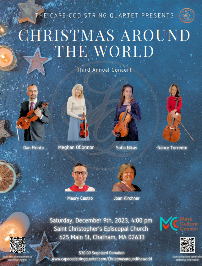 The Cape Cod String Quartet Presents “Christmas Around the World,” its third annual concert, on Saturday, December 9, at 4 PM, at Saint Christopher’s Church, 625 Main Street, Chatham.