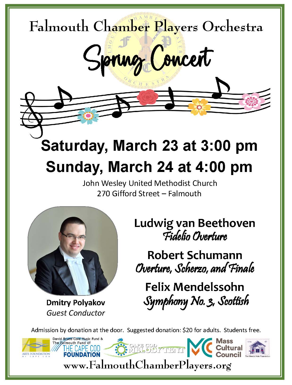 The Falmouth Chamber Players Orchestra, under the direction of guest conductor Dmitry Polyakov, will present its spring concerts on Saturday, March 23, at 3 PM, and Sunday, March 24, at 4 PM, at John Wesley United Methodist Church in Falmouth.