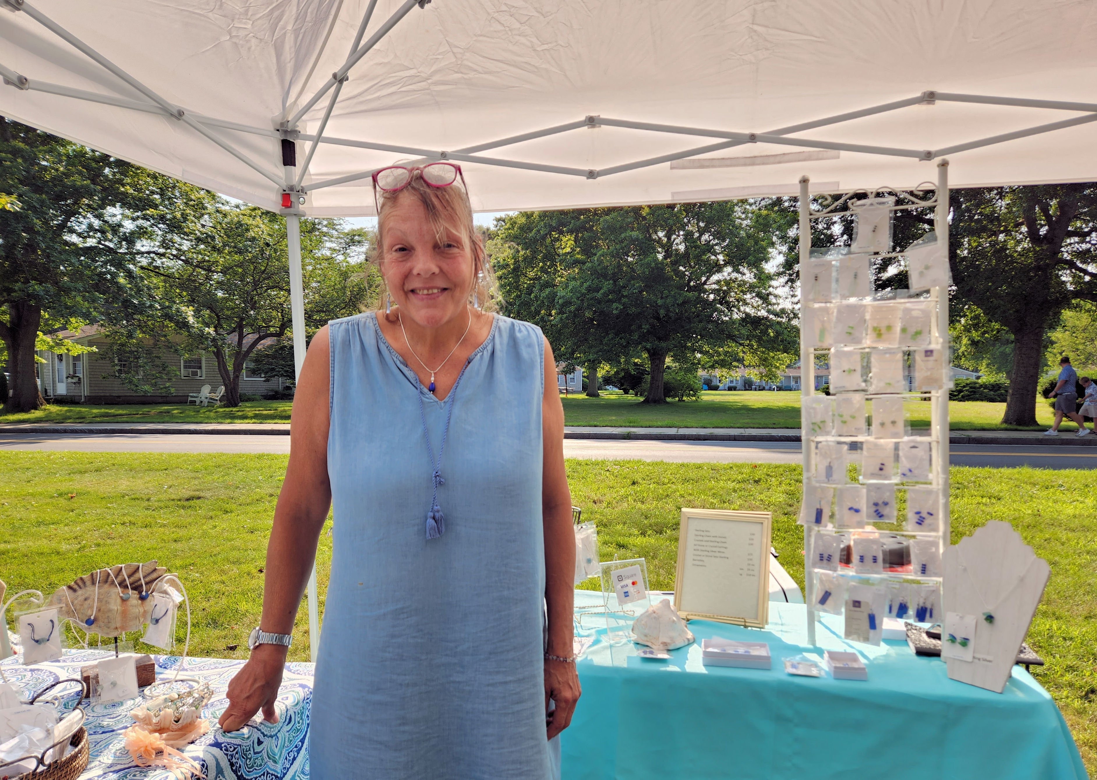 Among the vendors who will be at the Art Market this summer is Desiree Azarian, who makes sea glass jewelry and beach-inspired ornaments. Years ago she and a friend sold their creations at the Inkwell Bookshop on Main Street. Azarian made resin frames with beach glass, shells, and sand, while her partner made sea glass jewelry. When the store went out of business and her friend moved out of town, Azarian started making sea glass jewelry herself.