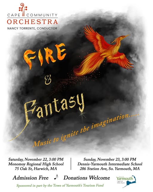 Cape Community Orchestra presents “Fire & Fantasy, a program of music to ignite the imagination” on Saturday, November 22, at 3 PM, at Monomoy Regional High School, 75 Oak St, Harwich, and Sunday, November 23th, at 3 PM at D-Y Intermediate School, 286 Station Ave, So Yarmouth. Doors open at 2:45 PM.
